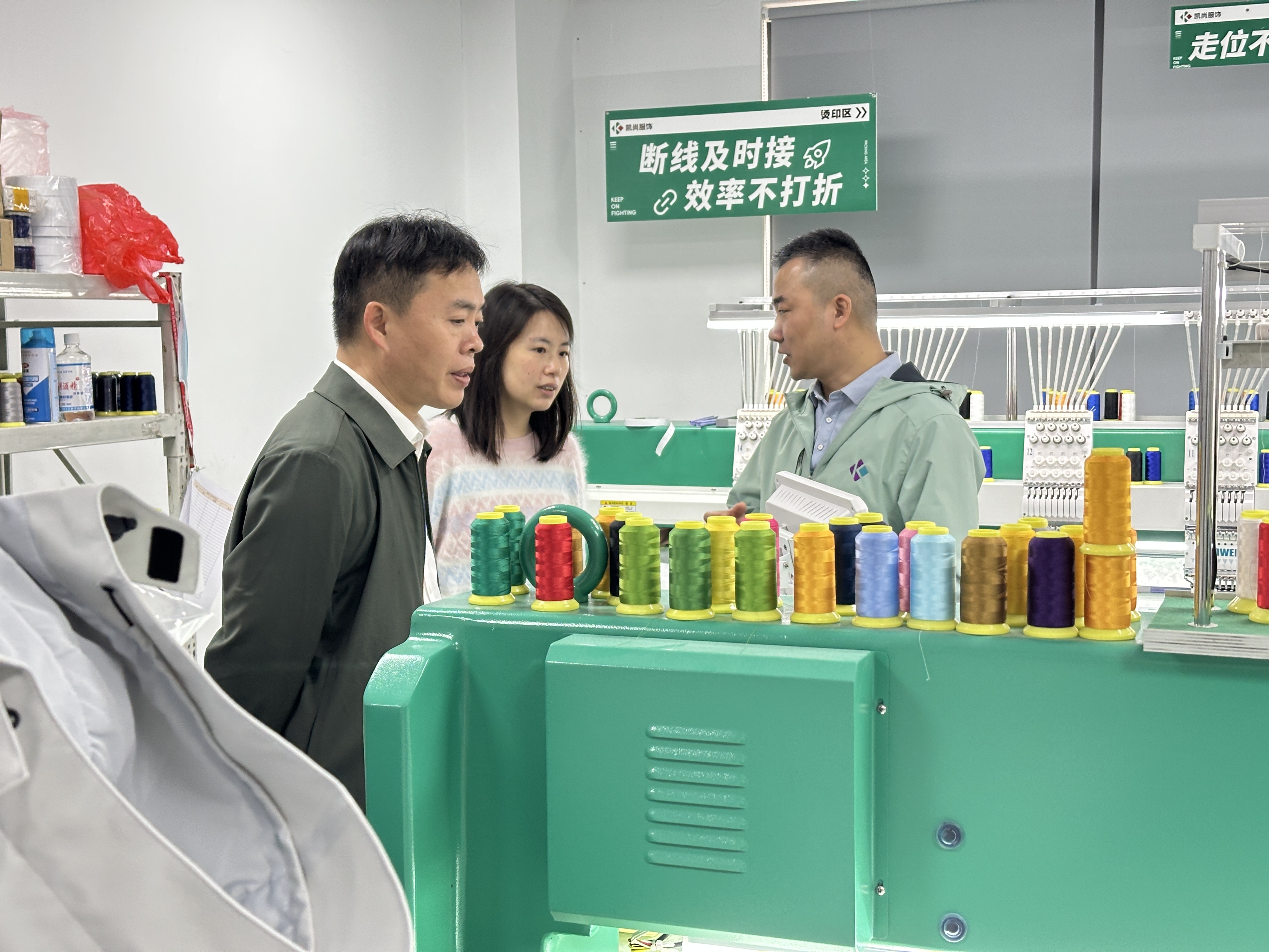 在视察过程中,领导们深入公司生产车间,实地察看了定制服装的加工流程与工艺细节,细致询问了员工的工作环境与生产保障措施,并对公司生产设备与规范化管理表示高度认可。唐书记强调:“企业要立足实体经济,坚守品质初心,同时紧跟时代步伐,推动技术升级与模式创新。”